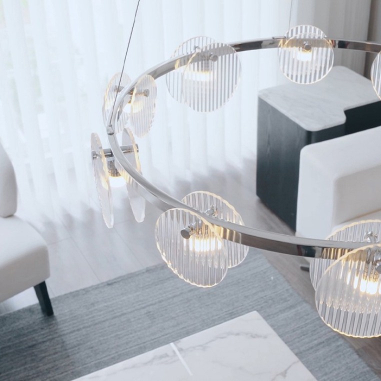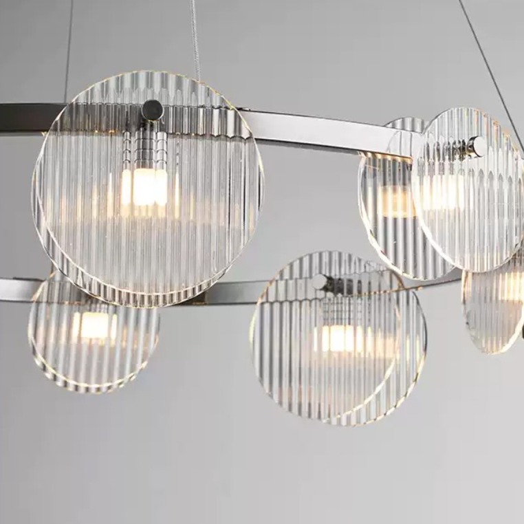 產品型號 Item LDL-275 名稱 漢諾現代玻璃吊燈-80 燈體尺寸 D80*H20CM 吊線可調節 底座15*3CM 材質 銅材 玻璃 產品顏色 鉻色 工藝 光源 內建LED 45W 3000K-6000K 調光 空間 餐廳 書房 等 層高 適用高度2米8左右空間高度 電壓 110-220V 下單前請告知 生產期 預售燈具 發貨週期60天左右 包裝 整體泡沫包裝 產地 中國制造 重量