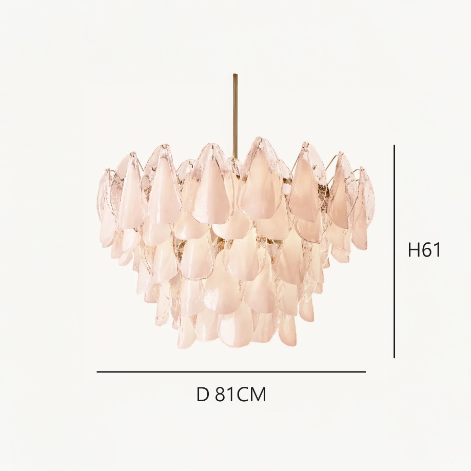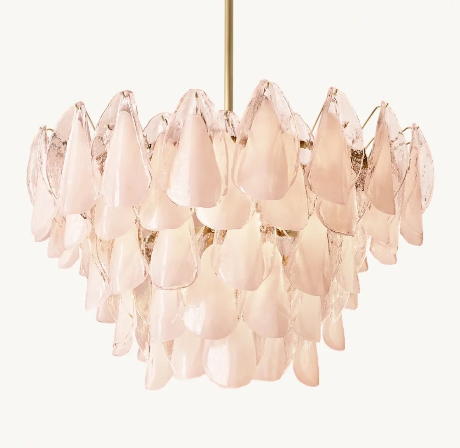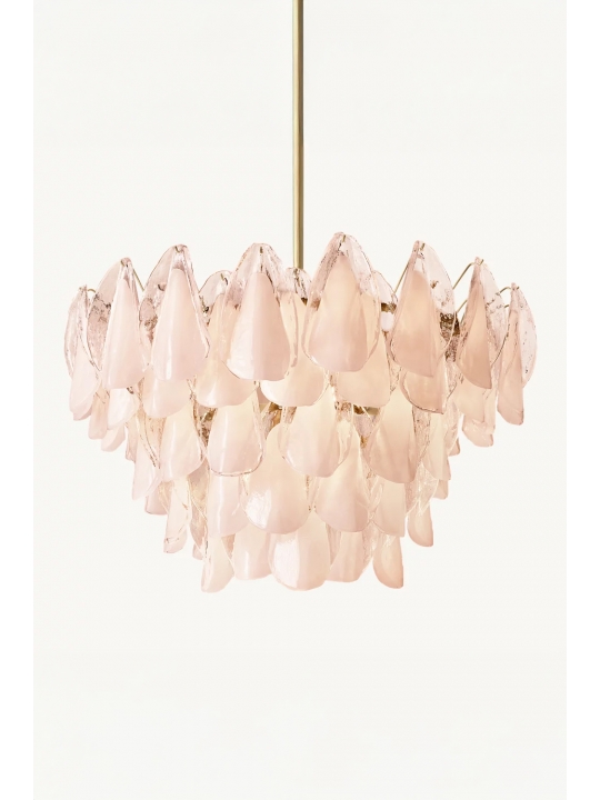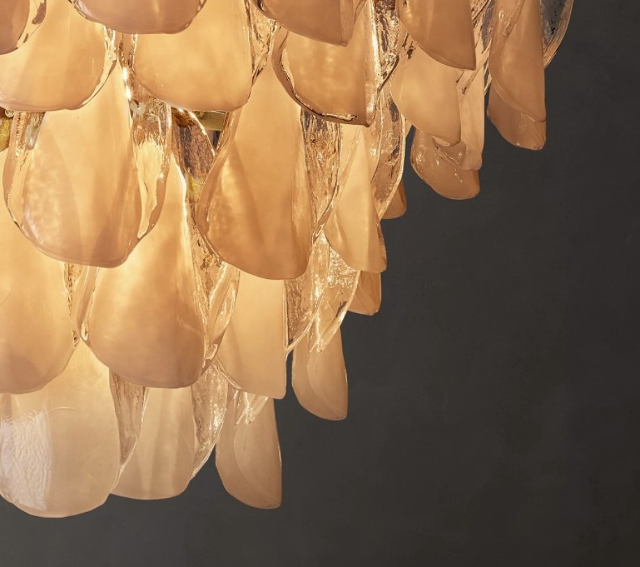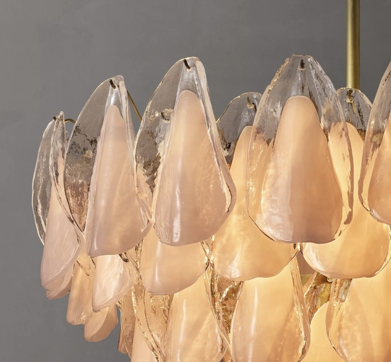 手工玻璃以花瓣系列提供靈感。這款燈具的半透明玻璃花瓣呈同心層狀懸掛在獨立的掛鉤上,點亮後,其彎曲的有機造型將房間籠罩在柔和的粉紅色光芒中。
